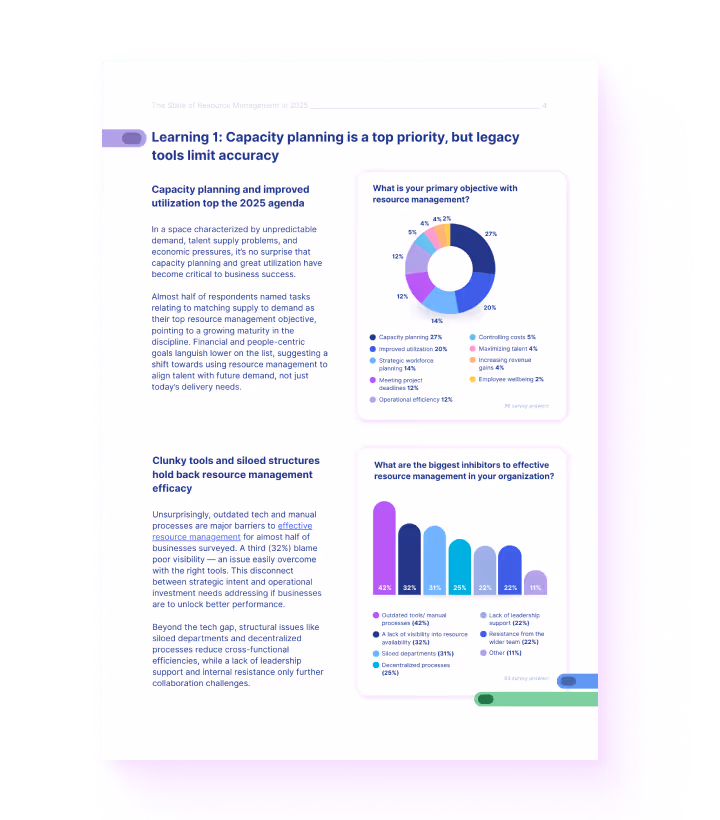 It's more than headcount - match the right people to projects. Real-time capacity forecasts guide hiring, reallocations, and pipeline to keep utilization balanced.