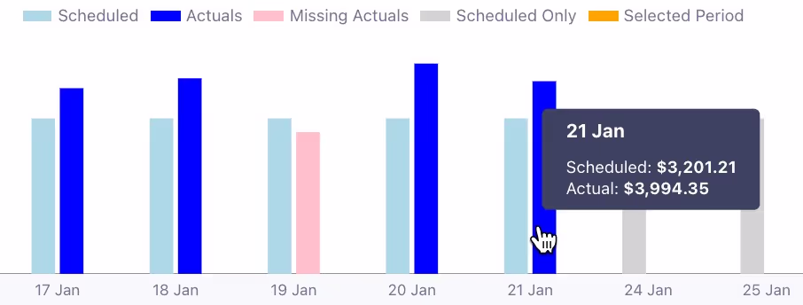 See the difference between your plans and reality, in dollars or hours, and by the day, week or month.