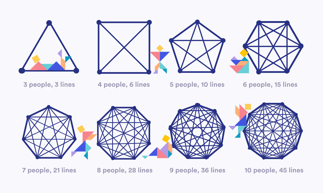 In one study, people were asked to build a Lego figure. Two-person teams took about 36 minutes to finish the project, while four-person teams needed 52 minutes to get there — which means they required 44% more time to complete the project.