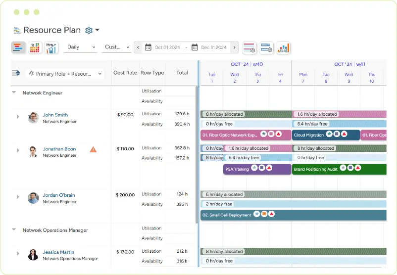 The People Planner is user-friendly and highly visual, with drag-and-drop allocation. Benefit from helpful insights insight resource capacity, availability, workload, project variance, and clashes.