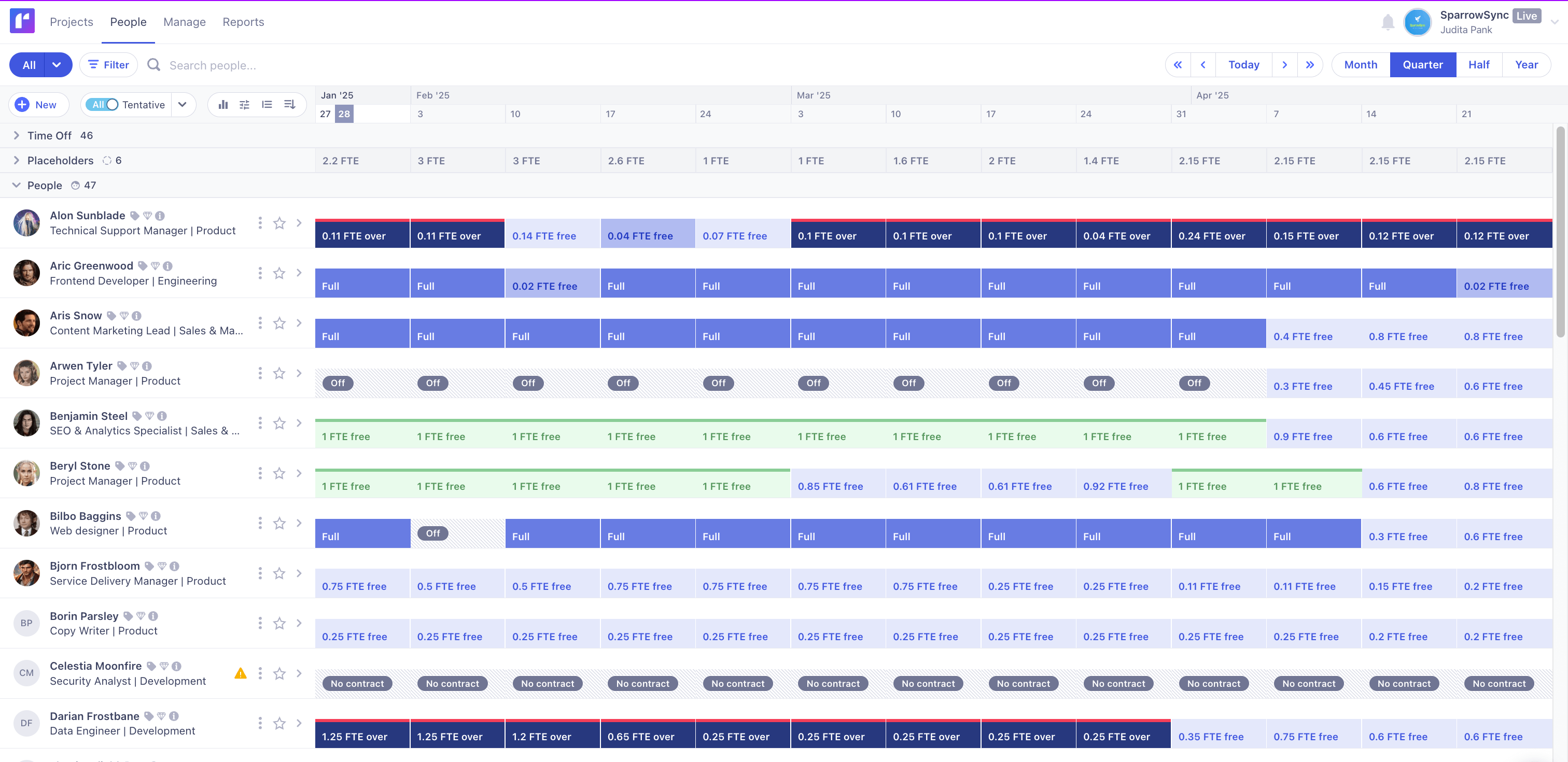 Any resource management platform worth its salt will give you real-time visibility into capacity, showing changes to resource allocations as they happen - whether that’s because a crucial resource has needed to take a sick day, or if someone is booking PTO, or if a role on a project has been reassigned to someone other than the original pick.