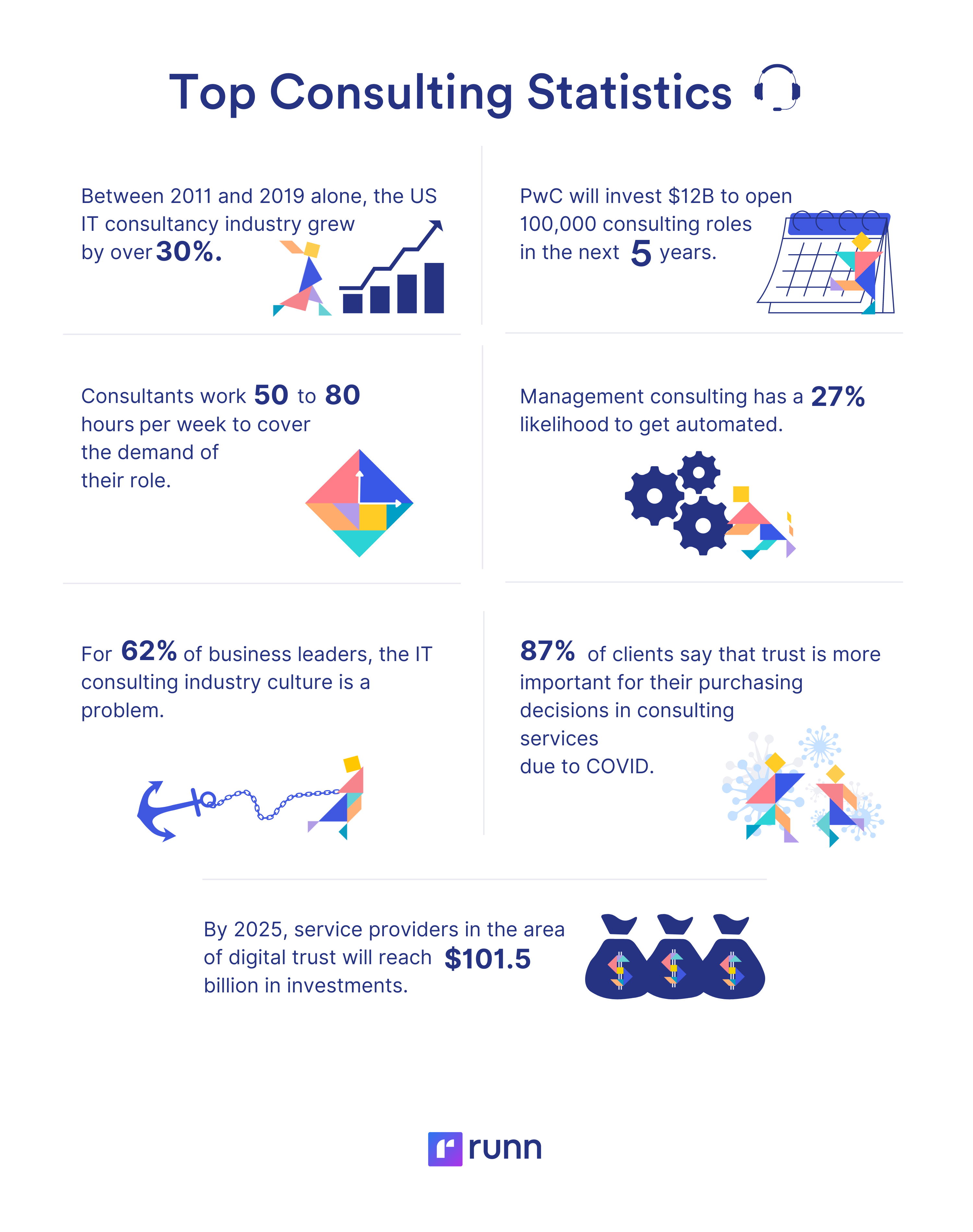 In the infographic below, we're going to summarize all the key consulting statistics you need to know. Then, we'll dive deep into each one of them and see what they mean and how you can learn from them.