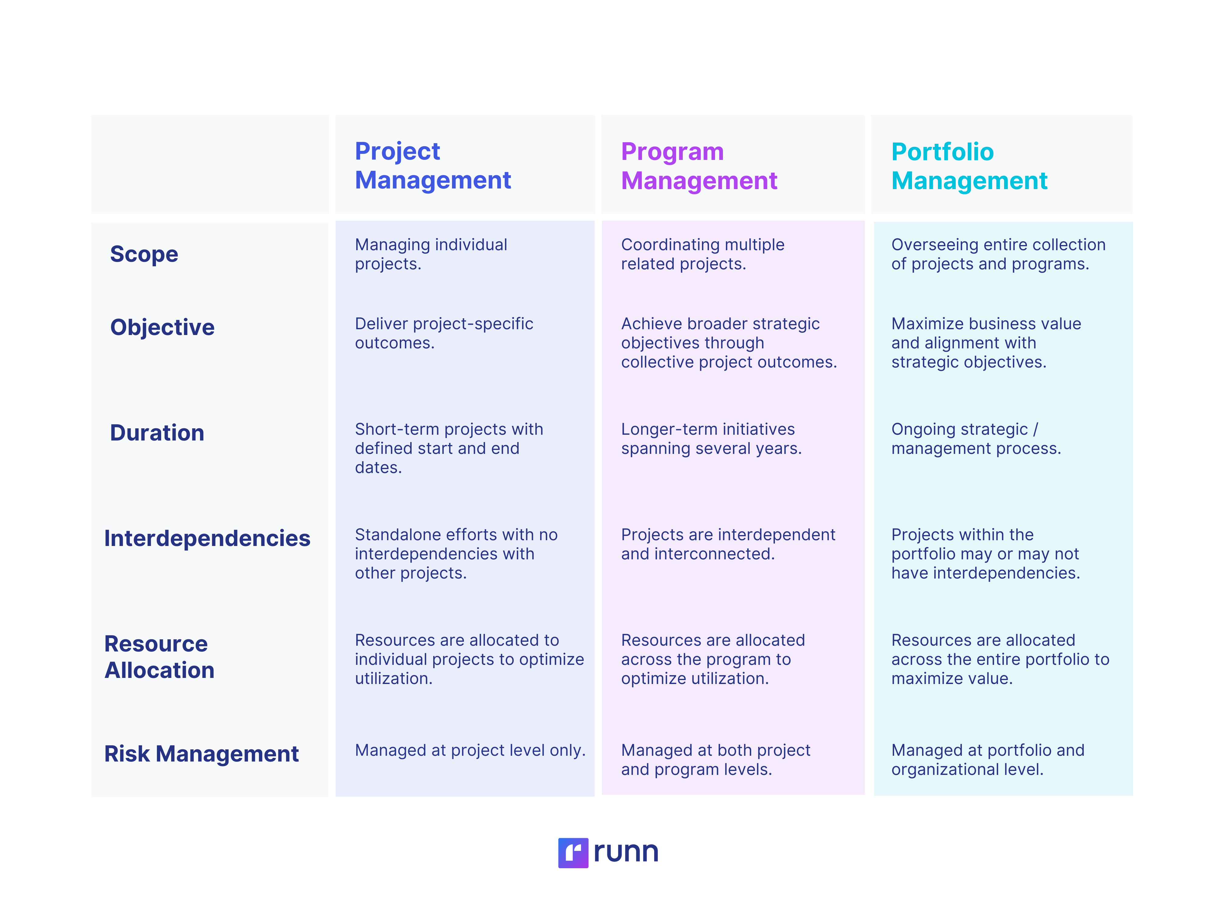 Project management, program management, and portfolio management differ in scope, duration, objectives, risk management, and much more. Check out the table below for the key differences.
