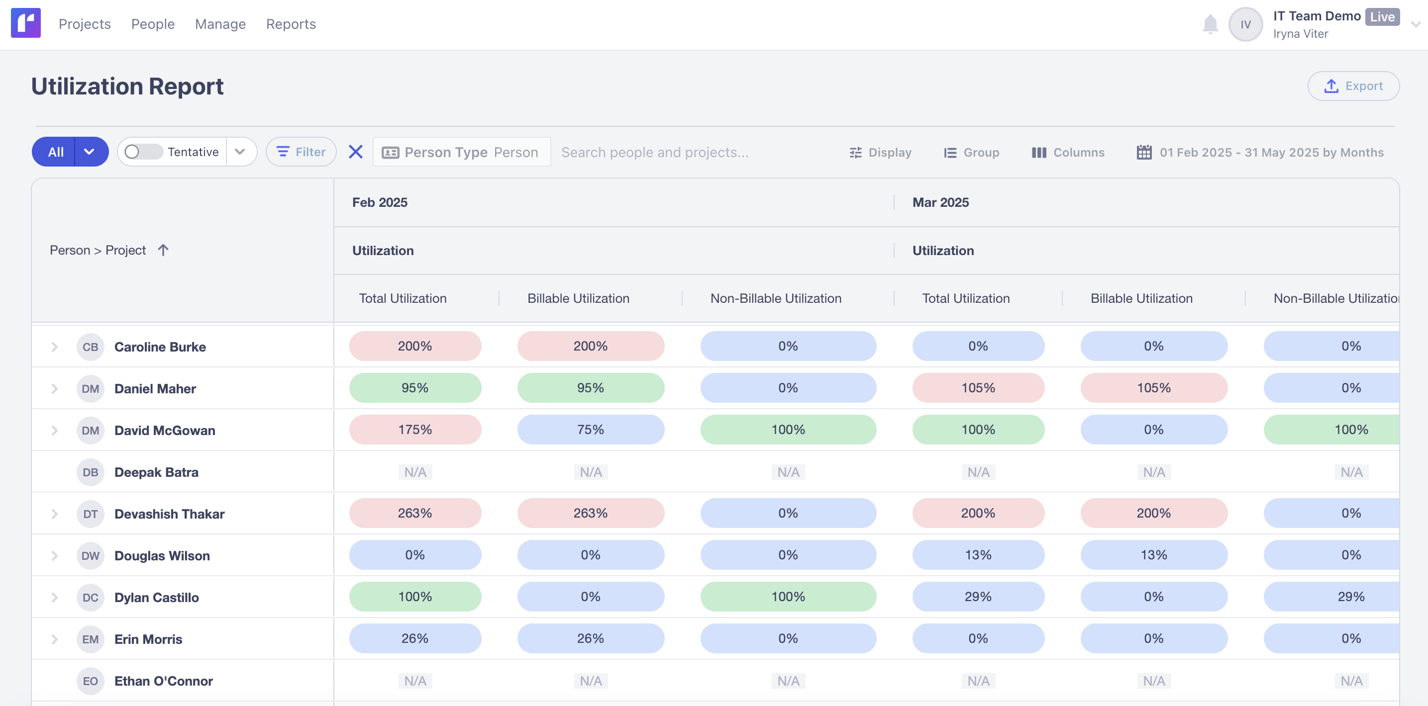 A resource utilization report provides at-a-glance insights into what percentage of your people’s capacity has been scheduled/used.