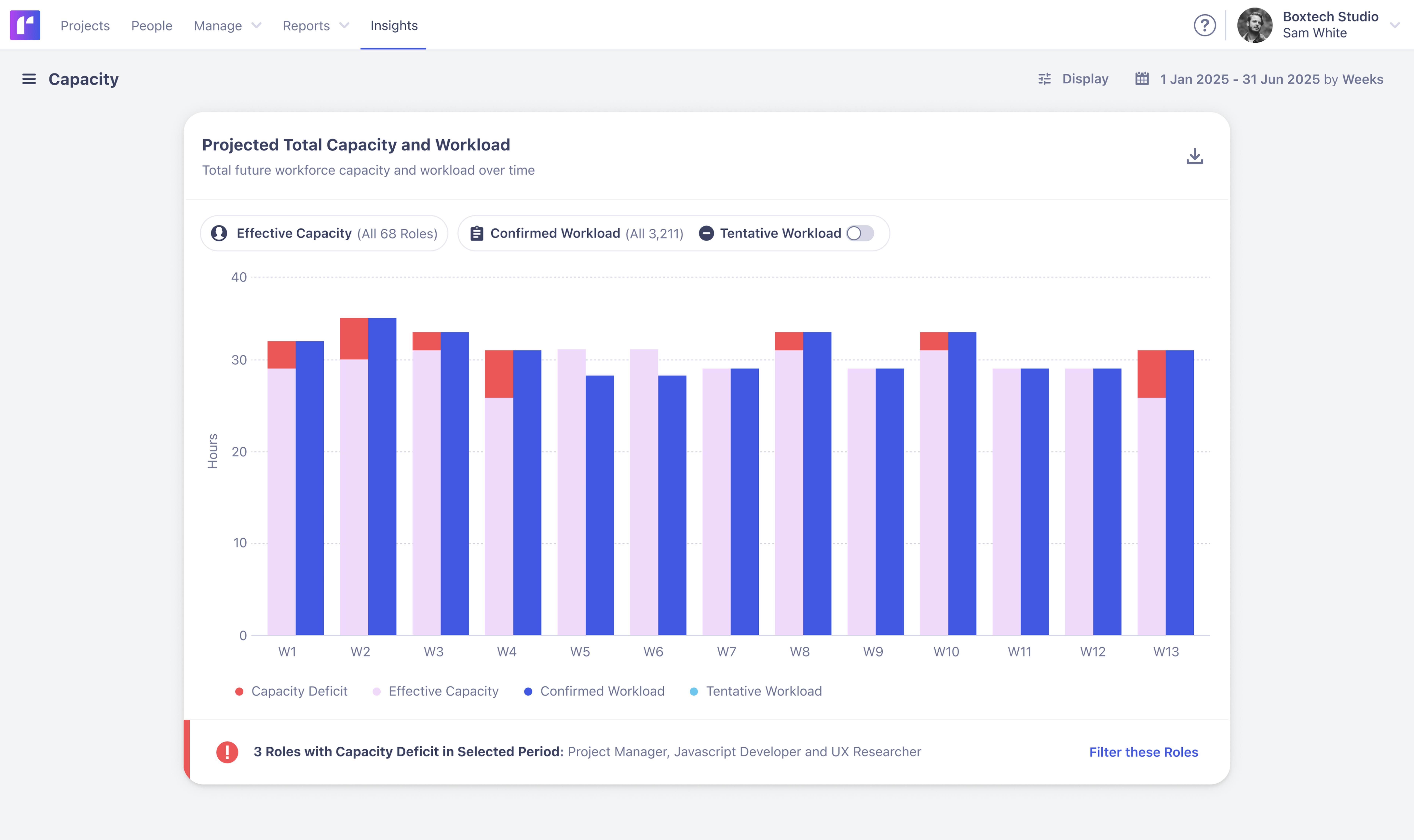 Senior leaders - Senior leaders can use a capacity report to answer key questions that underpin your business success. For example, can we complete confirmed work with the resources we have available? Do we have the bandwidth to take on additional projects? What future projects can we onboard with current staffing? Do we need to make changes to meet projected customer demand? Who do we need to hire - and when?