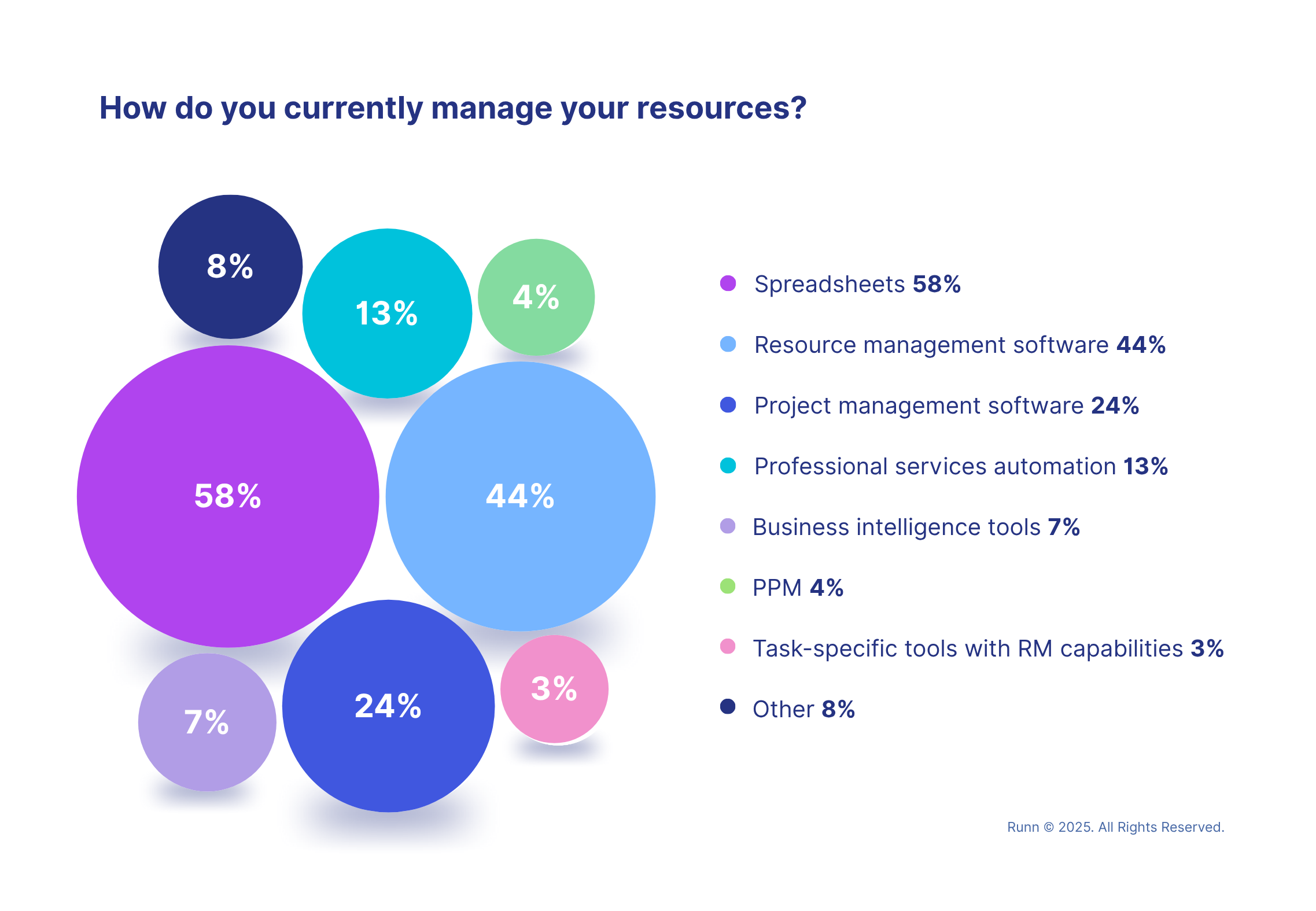 Runn's survey shows that just over half of organizations still use spreadsheets in some shape or form for resource management – whether for tracking availability, skills, or forecasting capacity.