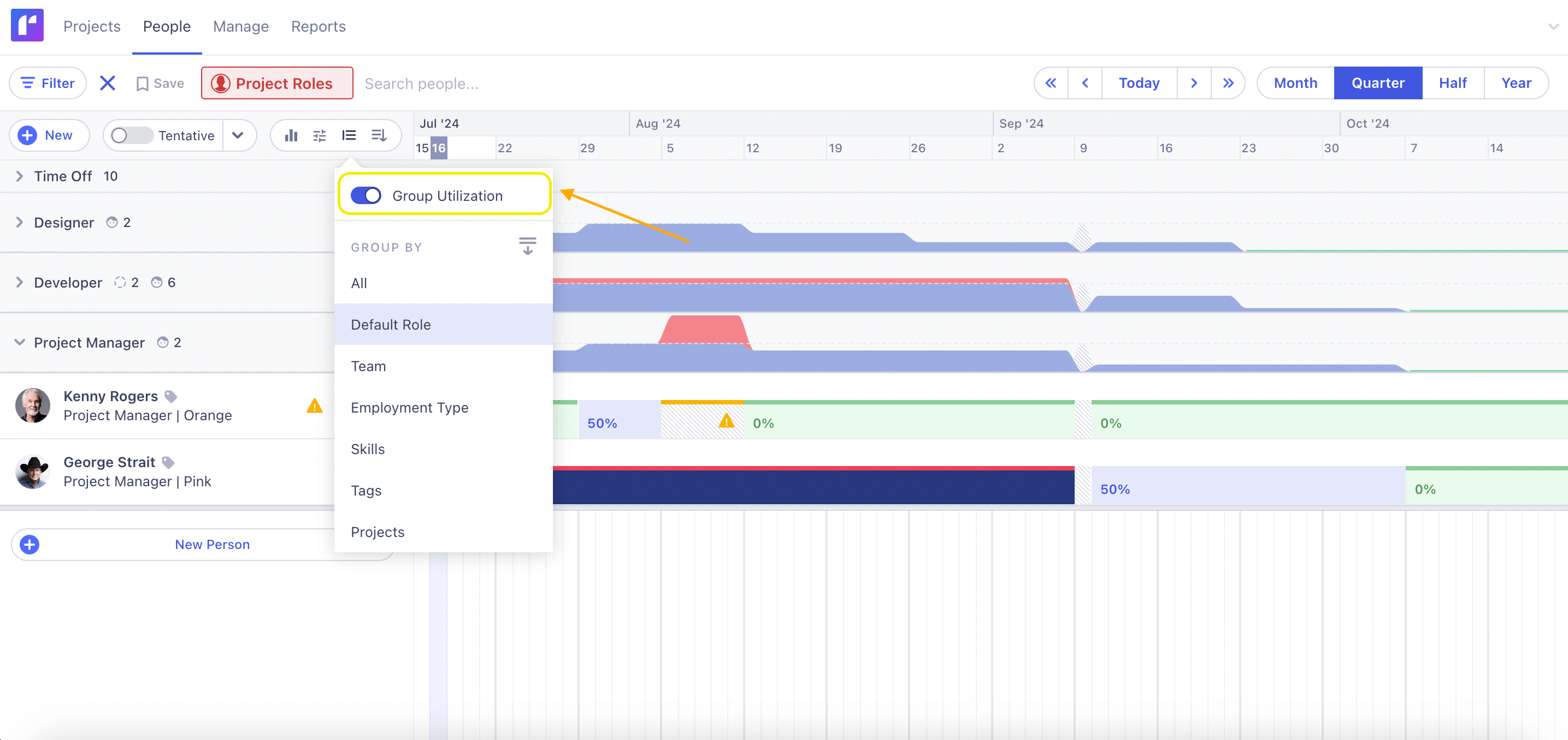 See that red mountain on the Project Manager role on the screenshot above? George is clearly overbooked with work.