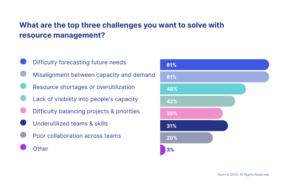 In fact, forecasting future needs is the top challenge firms face when it comes to resource management, with 61% citing it as their biggest struggle. (Source: Runn State of Resource Management 2025 report)