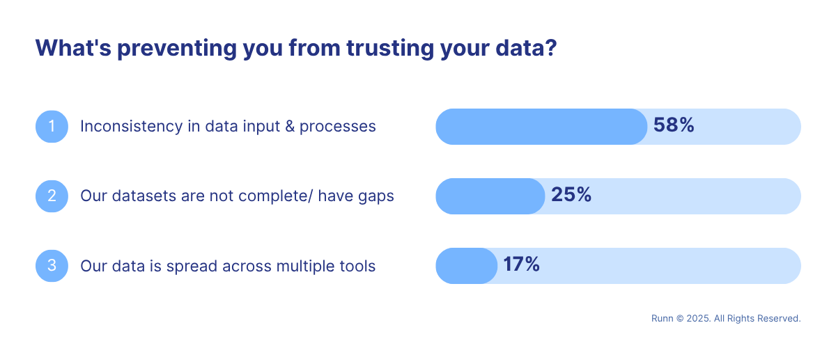 But it does require reliable data, and, unfortunately, this is a stumbling block for many firms. Only 10% of managers we asked said that they had complete confidence in their data, with the majority of respondents attributing their data woes to issues around systems, tooling, and processes: