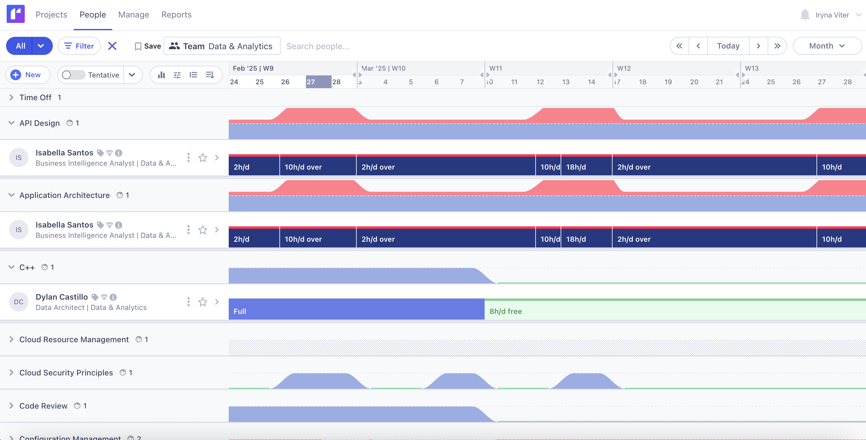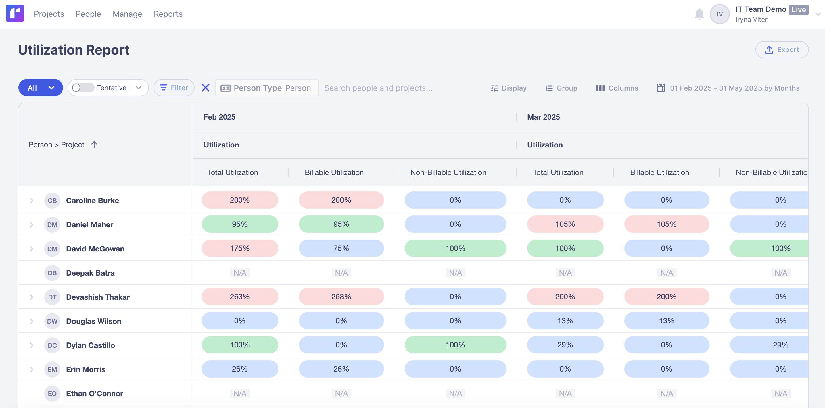 The solution then is full visibility into not just how packed each employee is, but also by how much. A resource management software serves as your single source of truth giving you full visibility into employee availability (both a bird's eye view and granular insight into their workload).