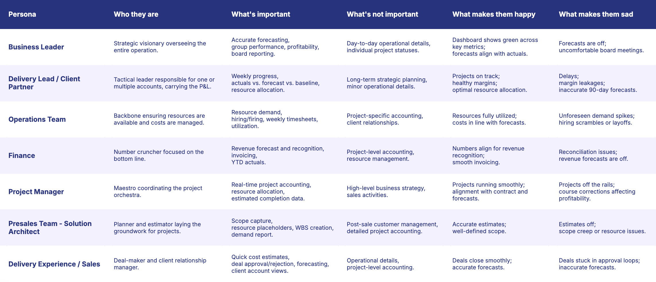 Though resource management holds services teams together, each stakeholder pulls meaning and priorities from it differently. Here are seven different personas and what could make them happy.