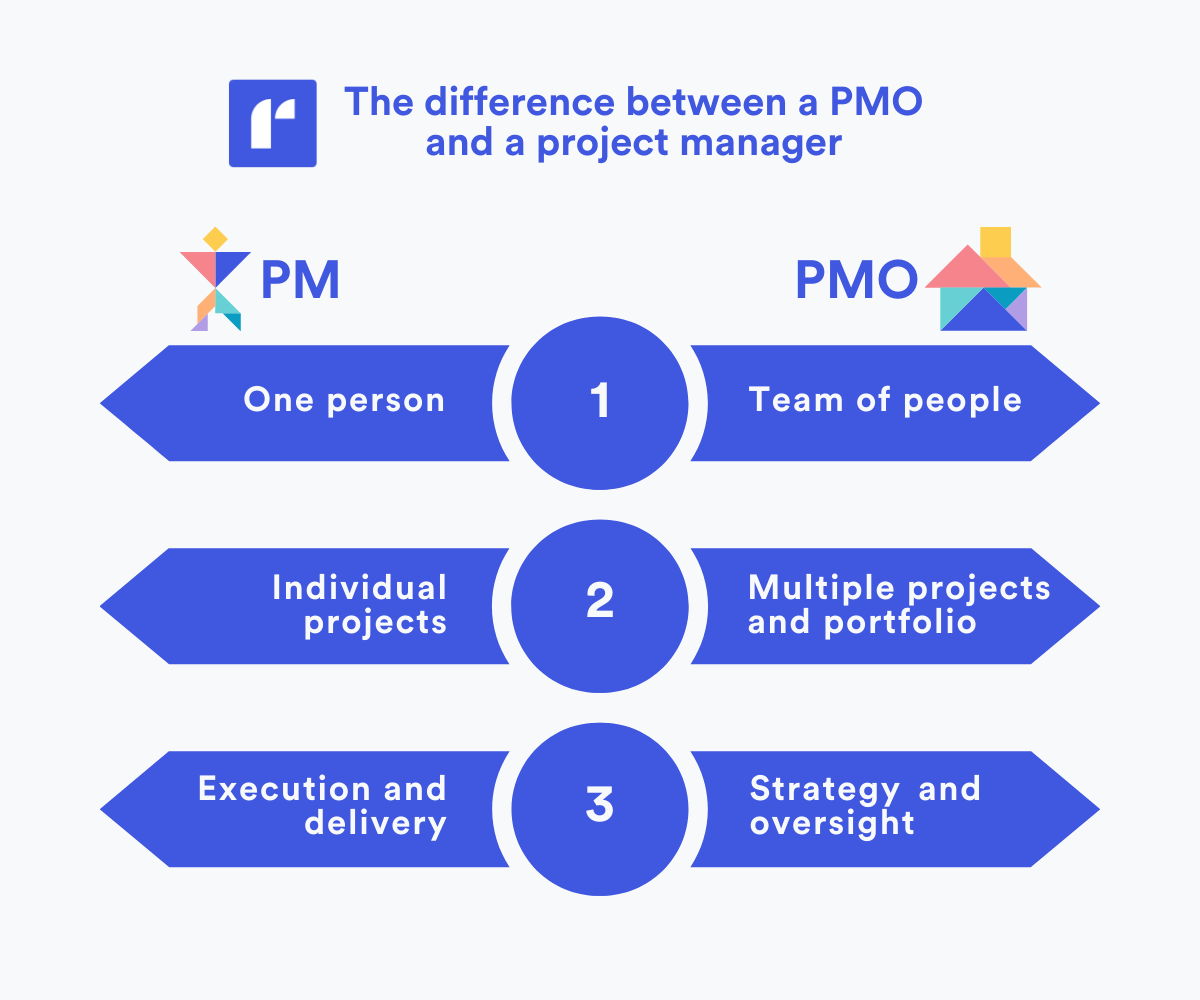 The first difference between a PMO and a PM is that a PMO is an organizational structure, whereas a project manager is an individual. A PMO team comprises a range of people responsible for project management excellence. This may include PMs - but also other roles in data and reporting, policy development, training, administration and more.