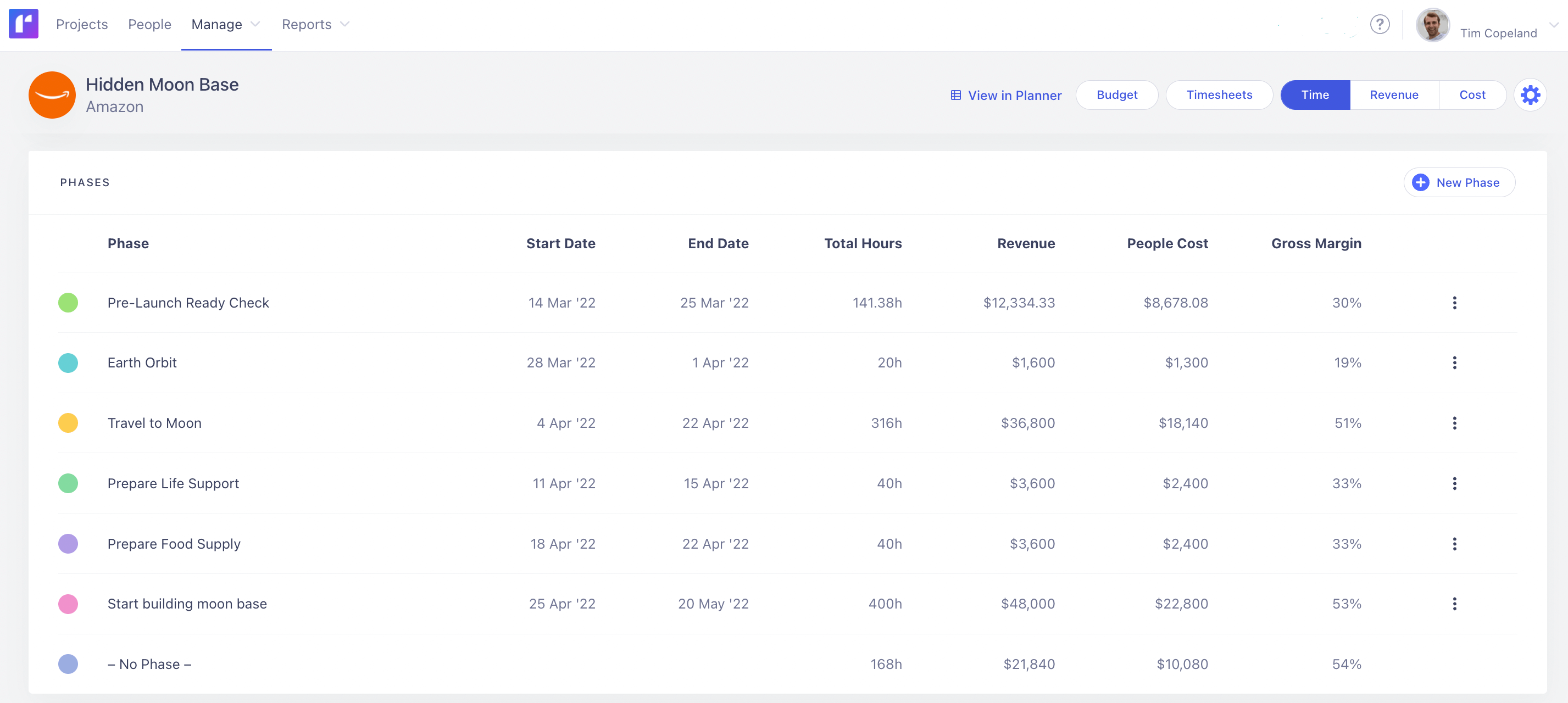 Project accountants usually prefer a more granular overview of these - that's why we've decided to include it in our phases reporting. In this project accounting example, a project is split into phases, and each phase has the associated tracking of revenue, cost, and margin.